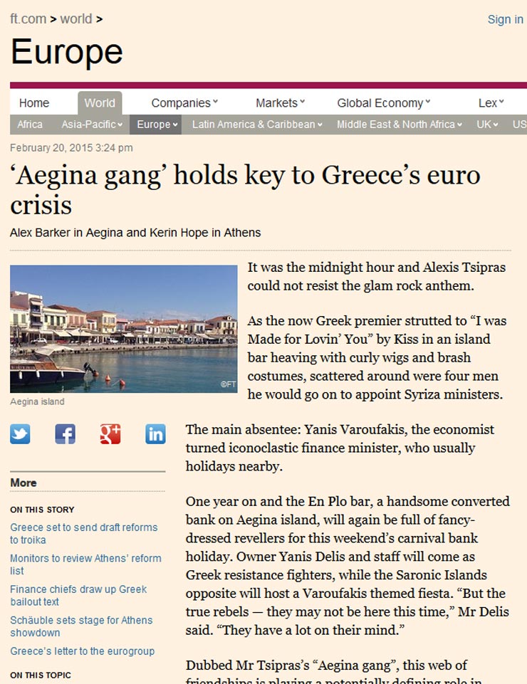 Η «παρέα της Αίγινας» παίζει έναν καθοριστικό ρόλο στην ευρωπαϊκή περιπέτεια της Ελλάδας, γράφουν οι «Financial Times». Εκεί, στο νησί, ο κ. Τσίπρας έγινε φίλος του κ. Βαρουφάκη και σχεδίασαν πώς η Αθήνα μπορούσε να αντιμετωπίσει τη Γερμανία για να ξαναγράψει τους όρους της διάσωσης. Εκεί επίσης ο κ. Τσίπρας δέθηκε με τον Αλέκο Φλαμπουράρη, έναν βετεράνο κομμουνιστή.
