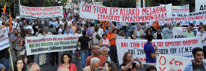 Σε απεργιακό κλοιό βρίσκονται η πρωτεύουσα και οι μεγάλες πόλεις της χώρας, με τους εργαζομένους να διαδηλώνουν κατά των μέτρων που απαιτούν οι δανειστές. Συγκεντρώσεις έχουν διοργανωθεί στην Αθήνα και σε άλλες πόλεις, μετά το κάλεσμα της ΓΣΕΕ και της ΑΔΕΔΥ αλλά και του ΠΑΜΕ, ενώ στις κινητοποιήσεις συμμετέχουν πρωτοβάθμια σωματεία, πολιτικές οργανώσεις και κόμματα, όπως ο ΣΥΡΙΖΑ και το ΚΚΕ.