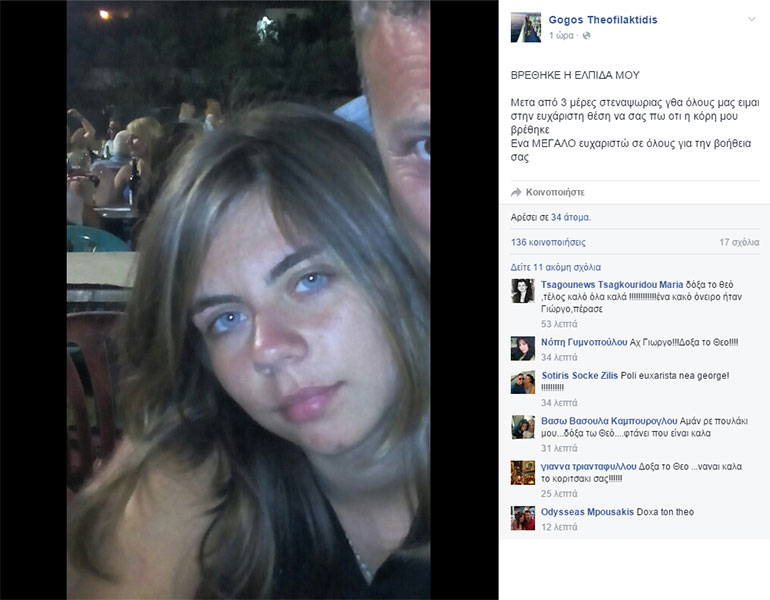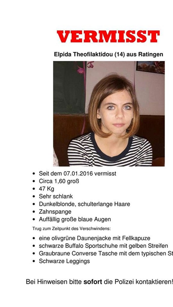 Τέλος έλαβε σήμερα η αγωνία για τη 14χρονη Ελπίδα Θεοφυλακτίδου, που είχε εξαφανιστεί στις 7-1-2016 από το Ράντινγκεν της Γερμανίας και αναζητούνταν από την οικογένειά της και τις αρχές, όπως αποκάλυψε το απόγευμα του Σαββάτου ο πατέρας της κοπέλας, με ανάρτηση σε μέσο κοινωνικής δικτύωσης.