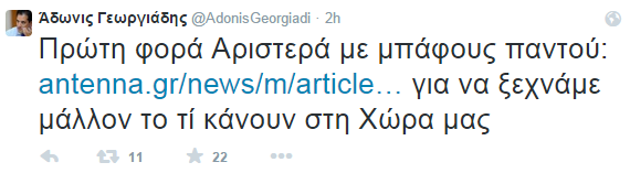 Αίσθηση προκάλεσε το σχόλιο του Άδωνι Γεωργιάδη στον προσωπικό του λογαριασμό στο twitter, όπου ανέφερε: «Πρώτη φορά Αριστερά με μπάφους παντού για να ξεχνάμε μάλλον το τί κάνουν στη Χώρα μας»…