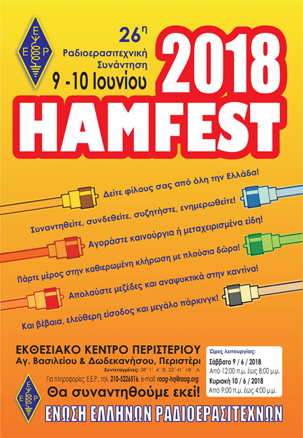 H 26η Πανελλήνια Ραδιοερασιτεχνική Συνάντηση θα πραγματοποιηθεί το Σαββατοκύριακο 9 και 10 Ιουνίου 2018 στο Εκθεσιακό Κέντρο Περιστερίου.