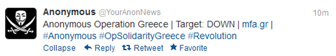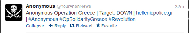 Με μία ανακοίνωσή τους στον λογαριασμό τους στο Twitter, οι Anonymous ανακοίνωσαν πως έριξαν τις σελίδες του ελληνικού υπουργείου Εξωτερικών και της Ελληνικής Αστυνομίας.