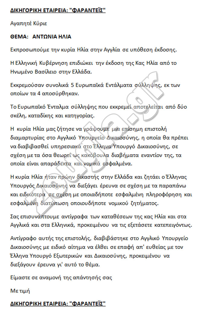 Την επιστολή που έστειλε προς τον υπουργό Δικαιοσύνης Χαράλαμπο Αθανασίου η δικηγορική εταιρεία «ΦΑΡΑΝΤΕΙΣ», που εκπροσωπεί την κ. Αντωνία Ηλία, δημοσιεύει το zougla.gr.