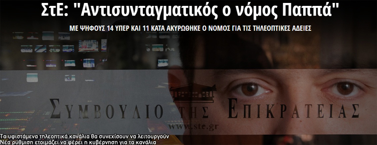 Aνατροπές προκαλεί η απόφαση-βόμβα του Συμβουλίου της Επικρατείας για τις τηλεοπτικές άδειες, το οποίο ήρθε σε ευθεία σύγκρουση με την κυβέρνηση στη σκιά των αποκαλύψεων για τον αντιπρόεδρο του ΣτΕ. Με την αντιπολίτευση να εξαπολύει νέα πυρά κατά της κυβέρνησης για τον τρόπο με τον οποίο επιχείρησε να ρυθμίσει το ραδιοτηλεοπτικό τοπίο, το Μέγαρο Μαξίμου τρέχει να προλάβει τις ραγδαίες εξελίξεις που φέρνει η απόφαση των δικαστών να κρίνουν αντισυνταγματικό τον νόμο Παππά.