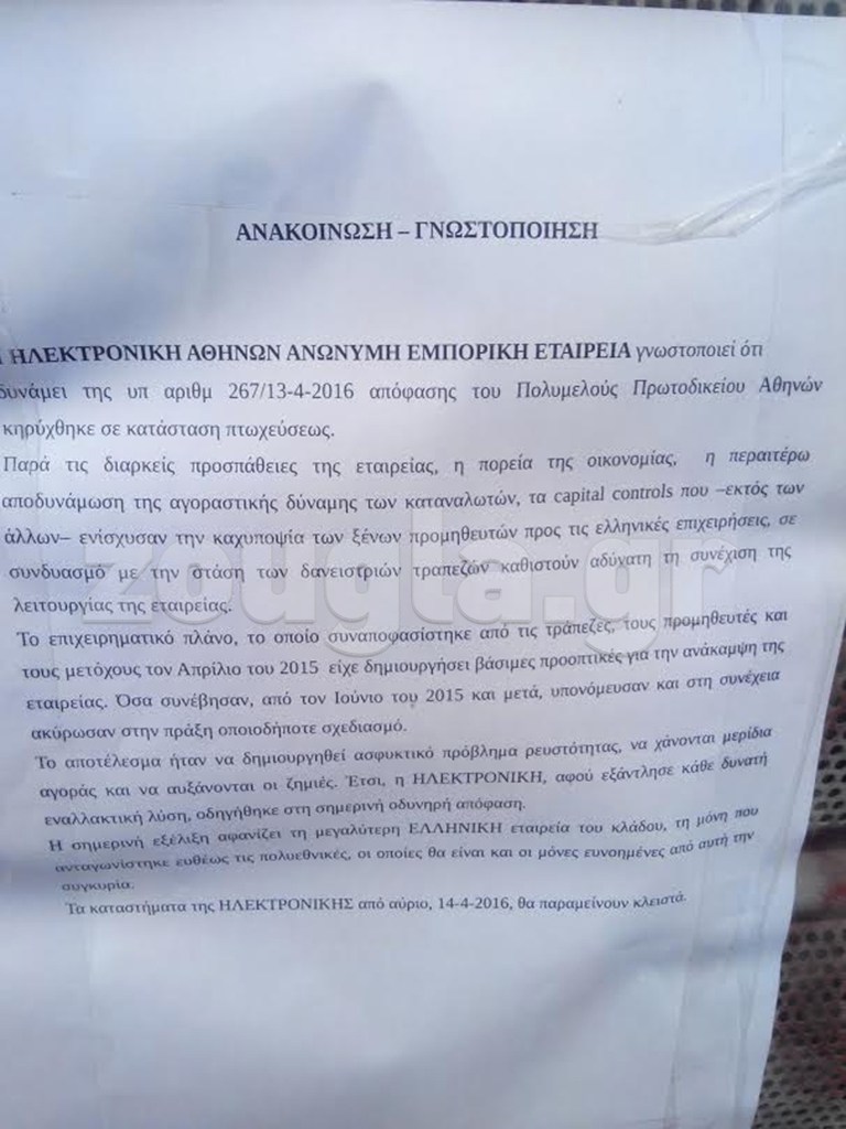 Σε απόγνωση βρίσκονται οι εργαζόμενοι της Ηλεκτρονικής Αθηνών, καθώς, όπως γνωστοποίησε η εταιρεία το απόγευμα της Τετάρτης όλα τα καταστήματα από την Πέμπτη 14 Απριλίου θα παραμείνουν κλειστά, έπειτα από την απόφαση του Πολυμελούς Πρωτοδικείου Αθηνών να κηρυχθεί η επιχείρηση σε κατάσταση πτώχευσης.