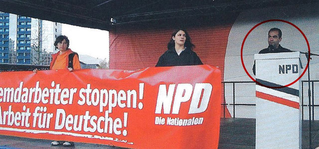 Ο εκπρόσωπος εξωτερικών επαφών της Χρυσής Αυγής Γιώργος Δημητρούλιας, όπως φαίνεται στη φωτογραφία, έβγαλε λόγο στα μέλη του κόμματος στεκούμενος δίπλα σε πανό που έγραφε: «Σταματήστε τους αλλοδαπούς εργάτες! Δουλειά μόνο στους Γερμανούς!», δηλαδή η μπάλα παίρνει και τους χιλιάδες Έλληνες που ζουν και εργάζονται εκεί.