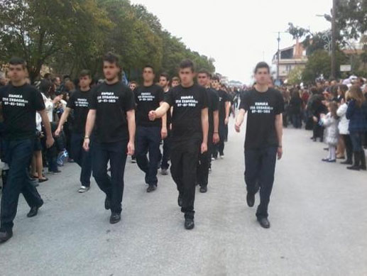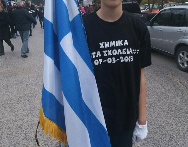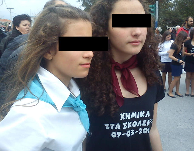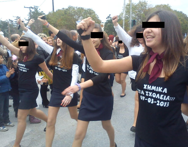 Στα μπλουζάκια τους αναγραφόταν «ΧΗΜΙΚΑ ΣΤΑ ΣΧΟΛΕΙΑ; 07-03-2013» και παρήλασαν με υψωμένες γροθιές μπροστά από τον κόσμο, θέλοντας να δείξουν πως η νέα γενιά δεν πτοείται από την άγρια καταστολή.