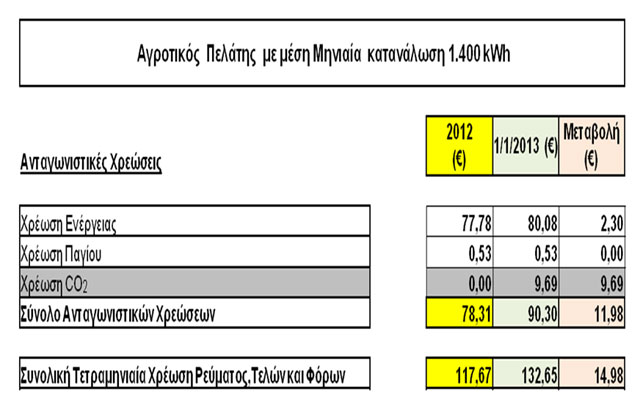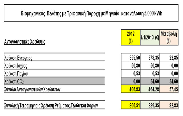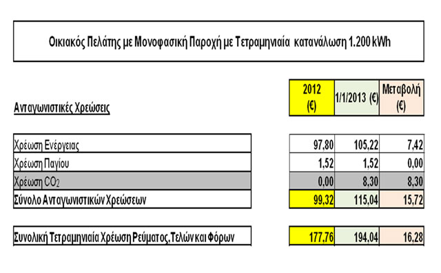 • το γεγονός ότι από το 2013 και μετά η ΔΕΗ υποχρεούται από ευρωπαϊκή οδηγία να αγοράζει το σύνολο των δικαιωμάτων εκπομπής αερίων ρύπων (βάσει των 270 εκατομμυρίων ευρώ για CO2 σύμφωνα με τη γνωμοδότηση της ΡΑΕ, η μεσοσταθμική αύξηση των τιμολογίων στη χαμηλή τάση λόγω CO2 ανέρχεται στο 5%).