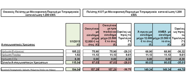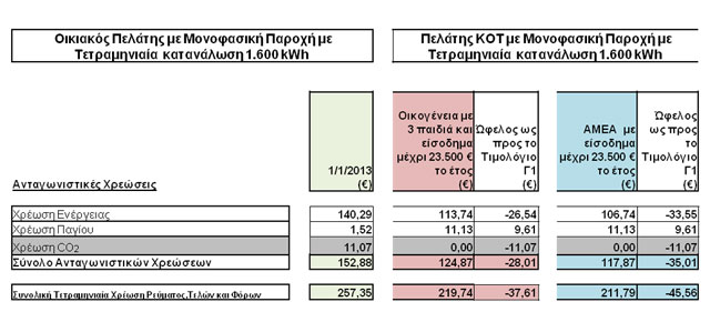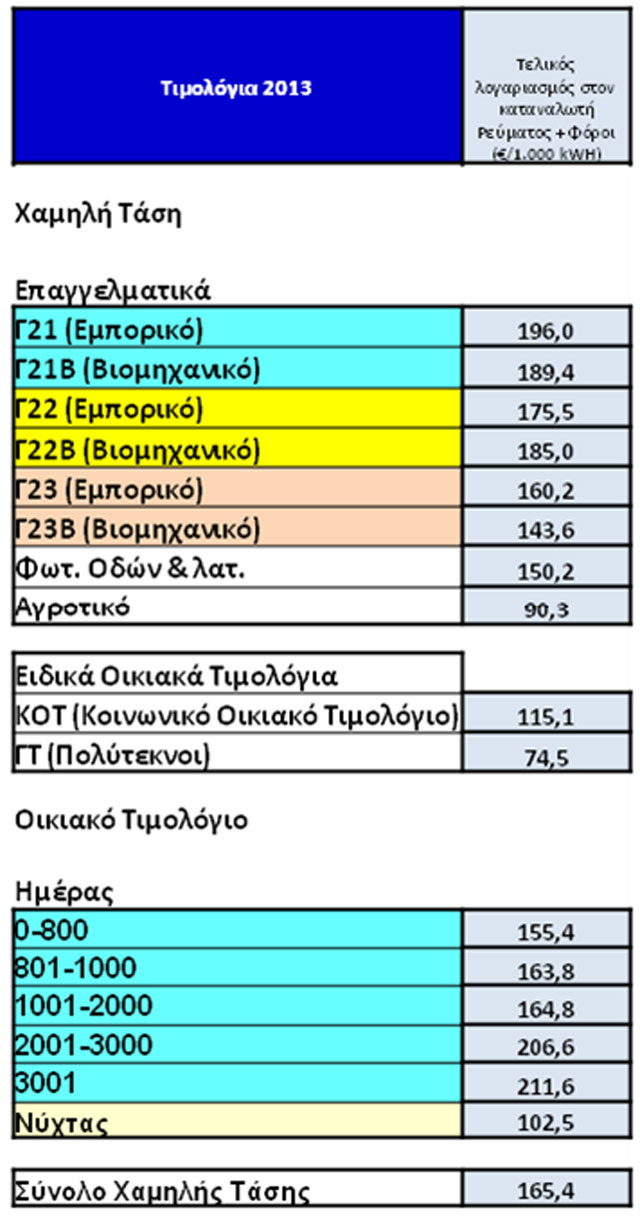 Έπειτα από γνωμοδότηση της Ρυθμιστικής Αρχής Ενέργειας και σχετική απόφαση του Υπουργείου Περιβάλλοντος, Ενέργειας και Κλιματικής Αλλαγής, τα νέα τιμολόγια χαμηλής τάσης της ΔΕΗ, που ισχύουν από την 1η Ιανουαρίου 2013 για την πρώτη φάση της εφαρμογής των κοστοβαρών τιμολογίων, διαμορφώνονται ως εξής: