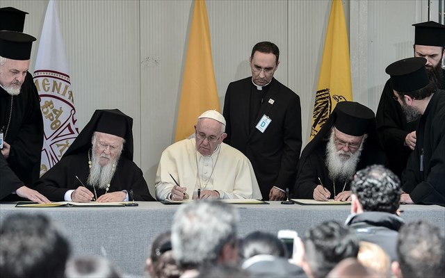 Ημείς ο Πάπας Φραγκίσκος, ο Οικουμενικός Πατριάρχης Βαρθολομαίος και ο Αρχιεπίσκοπος Αθηνών και πάσης Ελλάδος Ιερώνυμος, συναντηθήκαμε στο ελληνικό νησί της Λέσβου για να αποδείξουμε την βαθιά ανησυχία μας για την τραγική κατάσταση των πολυάριθμων προσφύγων, των μεταναστών και των αιτούντων άσυλο, που έχουν έλθει στην Ευρώπη, προσπαθώντας να ξεφύγουν από καταστάσεις συγκρούσεων και, σε πολλές περιπτώσεις, καθημερινών απειλών για την επιβίωσή τους. Η παγκόσμια κοινή γνώμη δεν μπορεί να αγνοήσει την τεράστια ανθρωπιστική κρίση που δημιουργήθηκε από την εξάπλωση της βίας και των ενόπλων συγκρούσεων, τις διώξεις και τον εκτοπισμό των θρησκευτικών και εθνικών μειονοτήτων και τον ξεριζωμό των οικογενειών από τα σπίτια τους, κατά παραβίαση της ανθρώπινης αξιοπρέπειας και των θεμελιωδών ανθρωπίνων δικαιωμάτων και ελευθεριών τους.