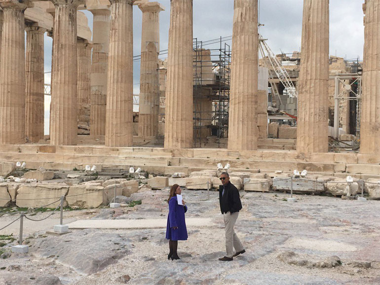 Στον ιερό βράχο της Ακρόπολης ξεναγήθηκε ο Μπαράκ Ομπάμα, από την κ. Ελένη Μπάνου, προϊσταμένη της Εφορείας Αρχαιοτήτων.