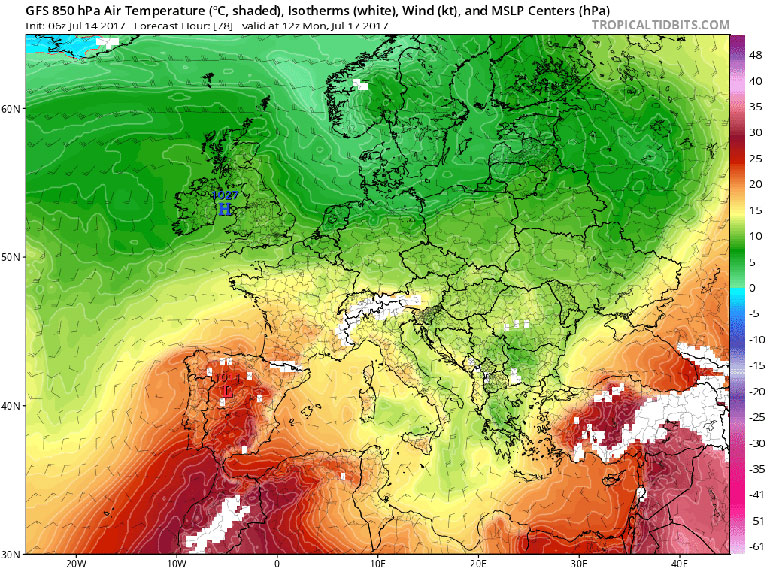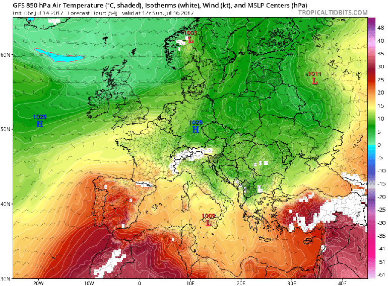 Στην κεντρική και βόρεια Ευρώπη , ο καιρός εξακολουθεί να διατηρείται σε θερμοκρασιακές συνθήκες “Φθινοπώρου” με τις μέγιστες να μην ξεπερνούν τους 20-22 βαθμούς Κελσίου λόγω ψυχρών αέριων μαζών.