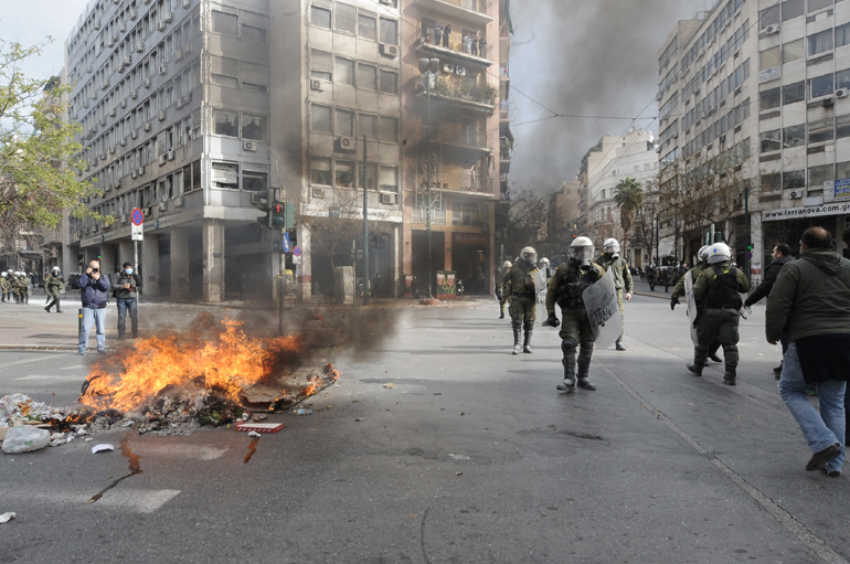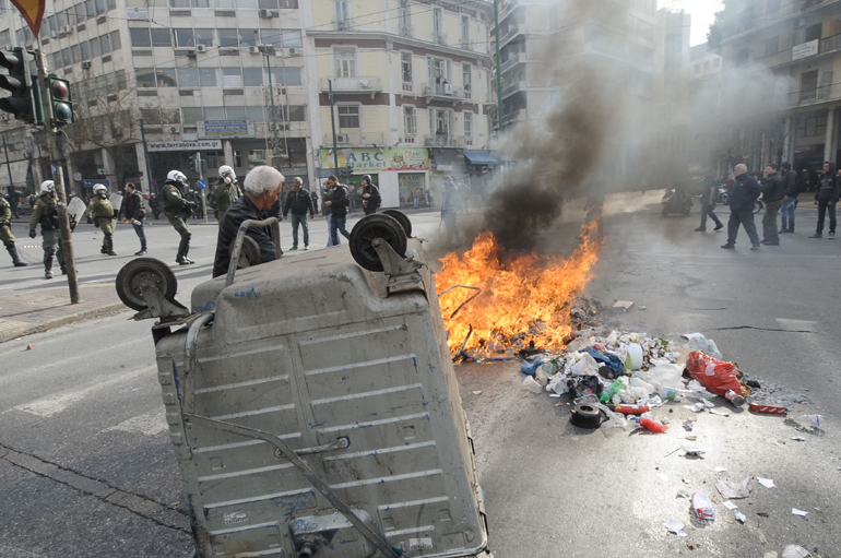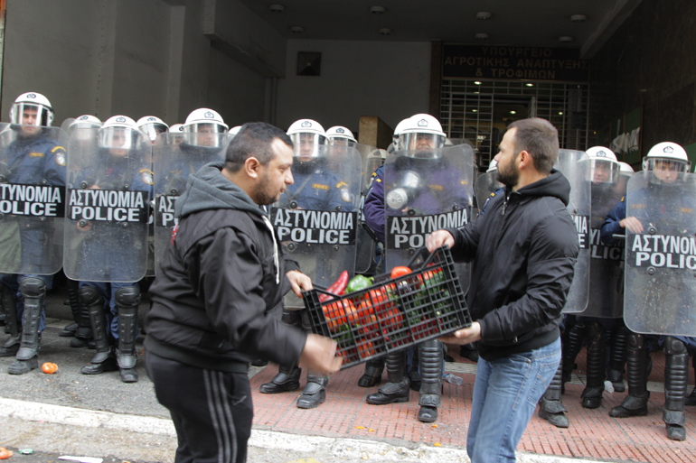 Όλα όσα επακολούθησαν αποτυπώθηκαν σε εικόνες: Φωτιές στο οδόστρωμα, σπασμένα τζάμια, φρούτα και λαχανικά στους δρόμους, κάδοι αναποδογυρισμένοι, αντεγκλήσεις και… κυνηγητό ανάμεσα σε παραγωγούς και αστυνομικές δυνάμεις συνέθεταν το τοπίο επί μία ώρα περίπου στο κέντρο της Αθήνας.