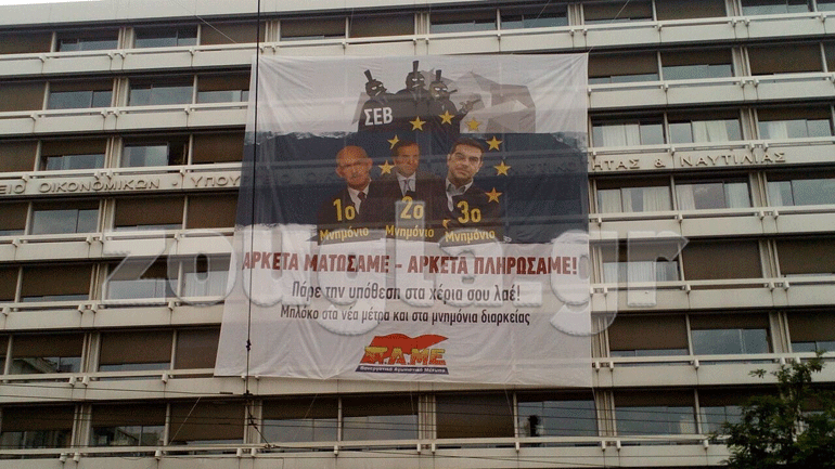 Ορισμένα από τα μέλη του ΠΑΜΕ κρέμασαν ένα τεράστιο πανό στην ταράτσα του κτηρίου επί της οδού Νίκης, το οποίο απεικονίζει τον Γιώργο Παπανδρέου και τον Αντώνη Σαμαρά με τα σχόλια «1ο Μνημόνιο» και «2ο Μνημόνιο» αντίστοιχα. Στο ίδιο πανό εμφανίζεται και ο Αλέξης Τσίπρας με το σχόλιο «3ο μνημόνιο».