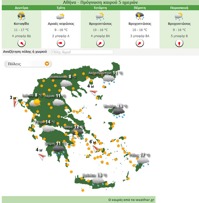 Νεφώσεις με βροχές και καταιγίδες στα ανατολικά και νότια και αργότερα στα βόρεια και νεφώσεις παροδικά αυξημένες στην Ήπειρο και τη δυτική ΜακεδονίαΗ θερμοκρασία θα κυμανθεί από 1 έως 15 βαθμούς Κελσίου στη Βόρεια Ελλάδα, από 11 έως 15 βαθμούς στην κεντρική και νότια Ελλάδα, από 3 έως 16 βαθμούς στη δυτική Ελλάδα, από 13 έως 18 βαθμούς στις Κυκλάδες, από 15 έως 19 βαθμούς στην Κρήτη, από 14 έως 17 βαθμούς στα νησιά του Ανατολικού Αιγαίου και τα Δωδεκάνησα.
