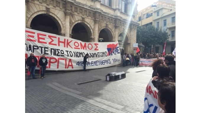 Οι συμμετέχοντες, με πορεία έφτασαν έξω από τη Λότζια, στην πλατεία Λιονταριών, ανήρτησαν έξω από το δημαρχείο πανό στο οποίο αναγραφόταν το σύνθημα «Πάρτε πίσω τον νόμο Λαιμητόμο», ενώ στο κέντρο της πλατείας τοποθετήθηκε συμβολικά ένα φέρετρο, με τους συγκεντρωμένους να στέκονται γύρω από αυτό, «θρηνώντας» την κατάρρευση του Ασφαλιστικού συστήματος και της ελληνικής κοινωνίας…