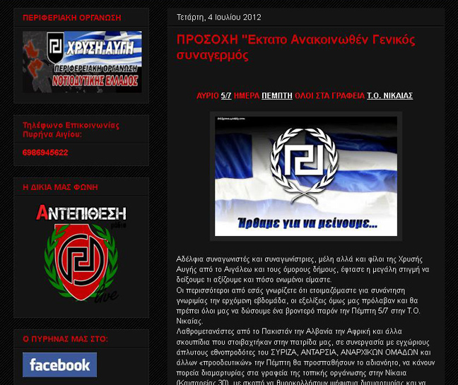 «Λαθρομετανάστες από το Πακιστάν την Αλβανία την Αφρική και άλλα σκουπίδια που στοιβάχτηκαν στην πατρίδα μας, σε συνεργασία με εγχώριους άπλυτους εθνοπροδότες του ΣΥΡΙΖΑ, ΑΝΤΑΡΣΙΑ, ΑΝΑΡΧΙΚΩΝ ΟΜΑΔΩΝ και άλλων “προοδευτικών” την Πέμπτη θα προσπαθήσουν το αδιανόητο, να κάνουν πορεία διαμαρτυρίας στα γραφεία της τοπικής οργάνωσης στην Νίκαια (Καισαρείας 30), με σκοπό να θυροκολλήσουν ψήφισμα διαμαρτυρίας και να απαιτήσουν το κλείσιμο των γραφείων μας. Έλληνες πατριώτες εθνικιστές, αυτό δεν θα περάσει, όχι τα γραφεία δεν θα κλείσουμε, αλλά ούτε να πλησιάσουν στα 500 μέτρα δεν θα τους αφήσουμε. Πρέπει να είμαστε ΟΛΟΙ εκεί, γυναικόπαιδα και ηλικιωμένοι κάτω από τα γραφεία μας να βροντοφωνάζουν για τις αξίες και τα ιδανικά του Έθνους και εμείς οι νεότεροι ως δύναμη περιφρούρησης, σε συνεργασία με τοπικές από όλη την Αττική να αποτρέψουμε τον εχθρό και να διασφαλίσουμε την σωματική ακεραιότητα των Ελλήνων της Νικαίας αλλά και της δημόσιας και ιδιωτικής περιουσίας που θα γίνει στόχος των αναρχομπολσεβίκων. Η παρουσία όλων σας είναι απαραίτητη, κινητοποιήστε τους πάντες, φίλους και γνωστούς. Η έκβαση των γεγονότων που θα λάβουν χώρα την Πέμπτη θα κρίνει τη μελλοντική μας θέση στην Δ. Αττική και Πειραιά».