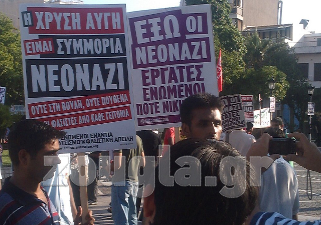 Επίθεση με βωμολοχίες κατά μελών του ΣΥΡΙΖΑ και διαφόρων άλλων αριστερών κομμάτων και οργανώσεων εξαπολύει η Χρυσή Αυγή, με αφορμή το αποψινό αντιρατσιστικό συλλαλητήριο που ξεκίνησε στις 19:00 στην πλατεία Αγίου Νικολάου στη Νίκαια.