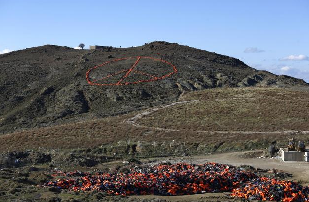 Συγκεντρώνοντας πάνω από 2.500 σωσίβια, που εγκαταλείπουν στις ακτές οι πρόσφυγες που φτάνουν καθημερινά στο νησί, έφτιαξαν το σήμα της ειρήνης…