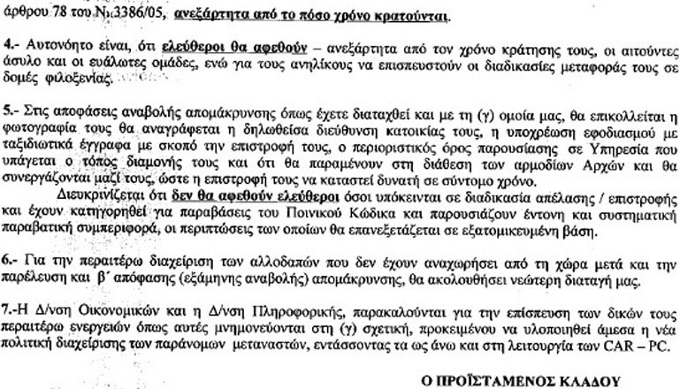 Αν μετά την παρέλευση του μήνα εντοπισθούν σε κάποια περιοχή της χώρας, θα τους δινόταν άδεια παραμονής άλλων 6 μηνών προκειμένου να ζήσουν νόμιμα, μέχρι να βρουν τρόπο να φύγουν από την Ελλάδα. Μέχρι πρότινος, οι μετανάστες που εντοπίζονταν χωρίς τα νόμιμα έγγραφα εισόδου και παραμονής στη χώρας, συλλαμβάνονταν και οδηγούνταν στα κέντρα κράτησης μεταναστών, στα οποία, σύμφωνα με τους Γιατρούς Χωρίς Σύνορα «οι συνθήκες διαβίωσης είναι τραγικές και απάνθρωπες και επικρατεί συνωστισμός».
