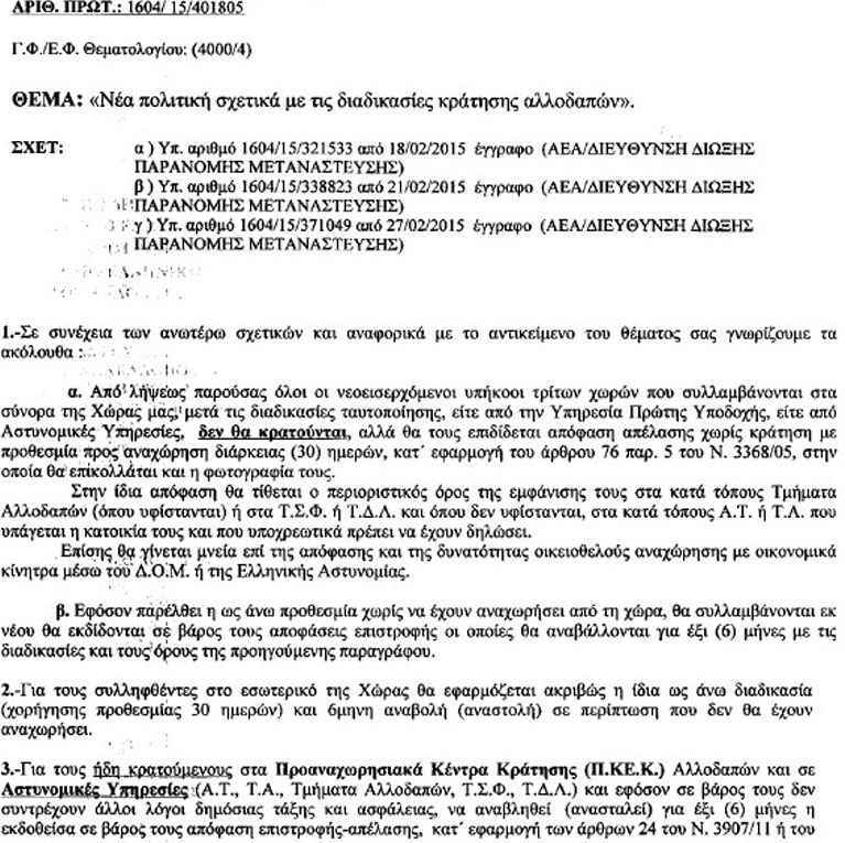 Πλήρη άγνοια για το επίμαχο έγγραφο δηλώνει ο υπουργόςΕπιπλέον, ξεκαθάρισε πως, από την πρώτη στιγμή, έδωσε εντολή για ανάκληση του εγγράφου, το οποίο «εξεδόθη εν αγνοία της πολιτικής ηγεσίας του Υπουργείου Εσωτερικών». «Το έγγραφο αυτό δεν συνιστά ούτε αντικατοπτρίζει την πολιτική της κυβέρνησης στο μεταναστευτικό ζήτημα. Δεν κοινοποιήθηκε ούτε εγκρίθηκε από την ηγεσία του υπουργείου» ανέφερε.