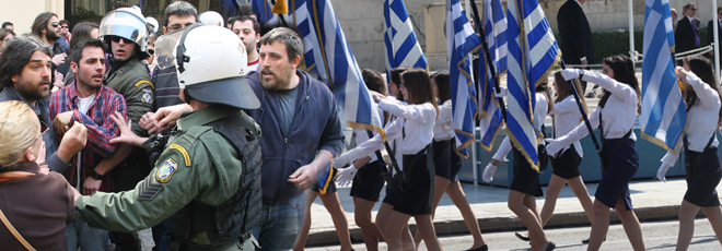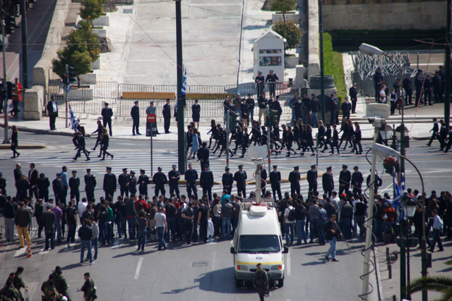 Με το κέντρο της Αθήνας υπό πλήρη αστυνομικό έλεγχο και την πλατεία Συντάγματος με ελάχιστους και επιλεγμένους πολίτες αλλά με την μαζική παρουσία αστυνομικών όλων των κατηγοριών και ειδικοτήτων, πραγματοποιήθηκε η μαθητική παρέλαση στα πλαίσια του εορτασμού της 25ης Μαρτίου.