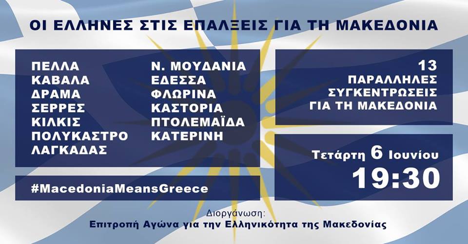 Την Τετάρτη 6 Ιουνίου 2018, στις 7.30′ το απόγευμα, ΟΛΟΙ ΟΙ ΕΛΛΗΝΕΣ ΚΑΙ ΟΛΕΣ ΟΙ ΕΛΛΗΝΟΠΟΥΛΕΣ, παρουσιαζόμαστε στις πλατείες των πόλεων που οργανώνουν τοπικές συγκεντρώσεις για την αποτροπή του εγκλήματος της παράδοσης του ονόματος της Μακεδονίας ΜΑΣ σε παραχαράκτες της ιστορίας που θέλουν με δυο δράμια μελάνι, να κάνουν δικό τους τον αμύθητο θησαυρό της Μακεδονικής Ιστορίας ΜΑΣ.