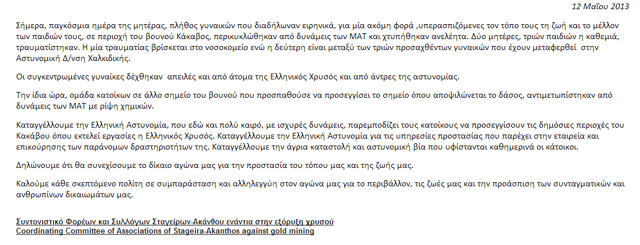 Μια ταραγμένη γυναίκα, oι αδερφές της οποίας διαμένουν στη Χαλκιδική και βρίσκονται στο μπλόκο της Ιερισσού, επικοινώνησε με το zougla.gr και ανέφερε: «Τα ανίψια μου αυτή τη στιγμή είναι στο βουνό, στον Κάκαβο. Από χθες δεν μπορούμε να επικοινωνήσουμε μαζί τους, τα κινητά τους δείχνουν να είναι κλειστά. Οι καμπάνες χτυπούν από όλα τα τριγύρω χωριά. Χθες ξυλοκόπησαν γυναίκες και μετά τις μετέφεραν στον Πολύγυρο. Ορισμένες από αυτές τις συνέλαβαν. Πέφτουν μολότοφ και χημικά. Τα ΜΑΤ είναι παντού.