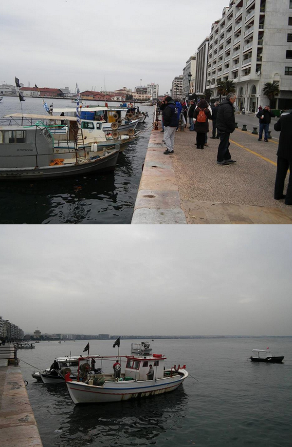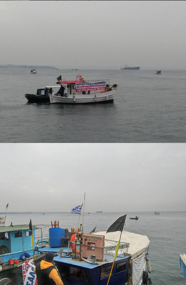 Μία πρωτότυπη διαμαρτυρία κατά του ασφαλιστικού νομοσχεδίου πραγματοποίησαν το πρωί οι αλιείς στο λιμάνι της Θεσσαλονίκης και στο ύψος της Αριστοτέλους.