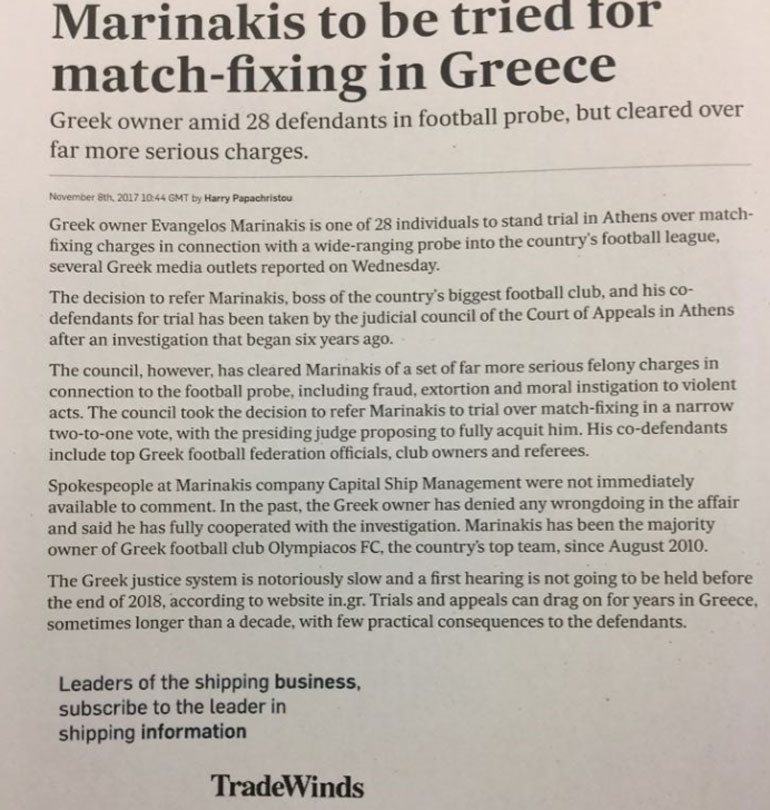 «Οι δίκες και οι εφέσεις μπορεί να «σέρνονται» για χρόνια στην Ελλάδα, σε μερικές περιπτώσεις περισσότερο κι από μια δεκαετία, με ελάχιστες πρακτικές συνέπειες για τους κατηγορούμενους»Εκπρόσωποι της εταιρείας του Μαρινάκη «Capital Ship Management» δεν ήταν διαθέσιμοι να σχολιάσουν. Στο παρελθόν, ο Έλληνας ιδιοκτήτης έχει αρνηθεί οποιαδήποτε εμπλοκή στο ζήτημα και είπε ότι θα συνεργαστεί πλήρως με τις Αρχές για το ζήτημα. Ο Μαρινάκης είναι ο μεγαλομέτοχος του Ολυμπιακού, της κορυφαίας ομάδας της χώρας , από τον Αύγουστο του 2010.
