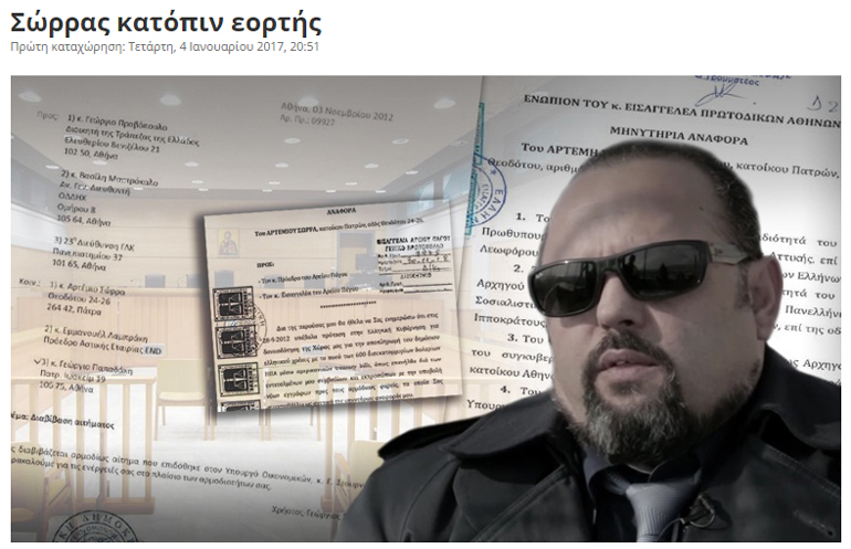 Στα χέρια της Εισαγγελίας του Αρείου Πάγου βρίσκεται άλλη μία αναφορά σε βάρος του Αρτέμη Σώρρα για σειρά αξιοποίνων πράξεων που αφορούν τη δράση της εγκληματικής, όπως χαρακτηρίζεται, οργάνωσής του η οποία συνδέεται με το «φαινόμενο κραυγαλέας εξαπάτησης των πολιτών». Με τη μηνυτήρια αναφορά ζητείται η ποινική δίωξη του Αρτέμη Σώρρα και του συνεργάτη του Εμμανουήλ Λαμπράκη για τα αδικήματα της σύστασης εγκληματικής οργάνωσης, της απάτης, διασποράς ψευδών ειδήσεων, διέγερσης πολιτών σε βιαιοπραγίες ή αμοιβαία διχόνοια, παράβασης καθήκοντος, καθώς και για εγκλήματα σχετικά με το νόμισμα.