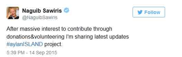 Ο τρίτος πλουσιότερος Αιγύπτιος έχει ήδη προκρίνει την ονομασία «Άιλαν» για ένα από τα νησιά -εάν τελικά το σχέδιό του ευοδωθεί- προς τιμήν του 3χρονου αγοριού που πνίγηκε πρόσφατα ανοικτά της Κω, κατά τη διάρκεια ταξιδιού με λέμβο.