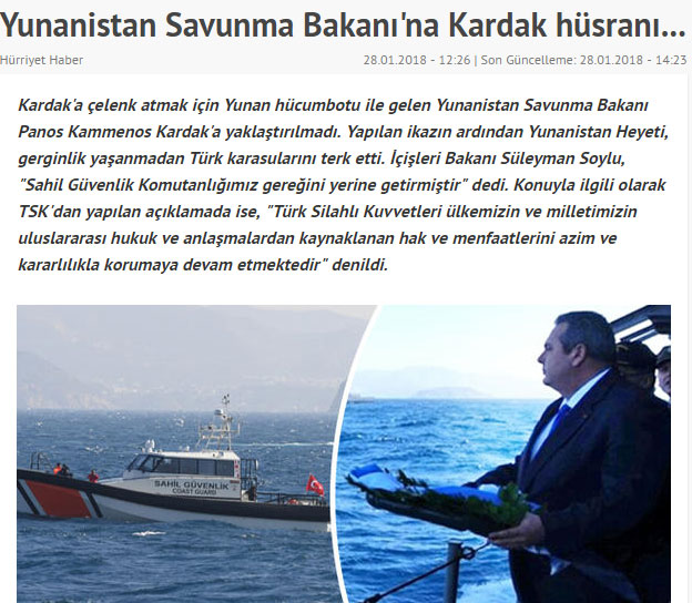 Λίγο αργότερα η ίδια εφημερίδα ανάρτησε τις εξής πληροφορίες: Όταν εμφανίστηκε η κανονιοφόρος ένα τουρκικό ελικόπτερο υπερίπτατο της περιοχής και ένα τουρκικό σκάφος παρεμπόδισε το ελληνικό πλοίο. Κατά την τουρκική εφημερίδα η ένταση κράτησε μισή ώρα και στη συνέχεια το ελληνικό σκάφος αποχώρησε.