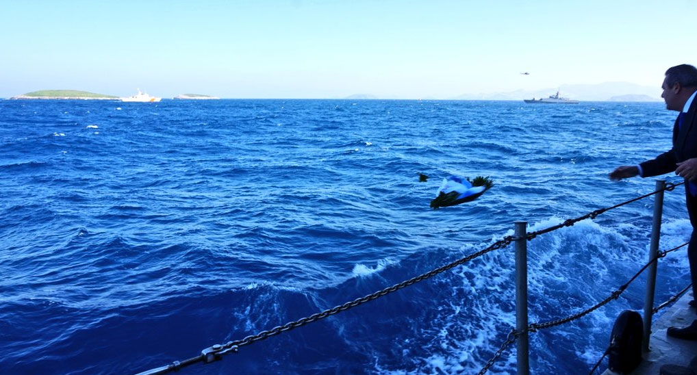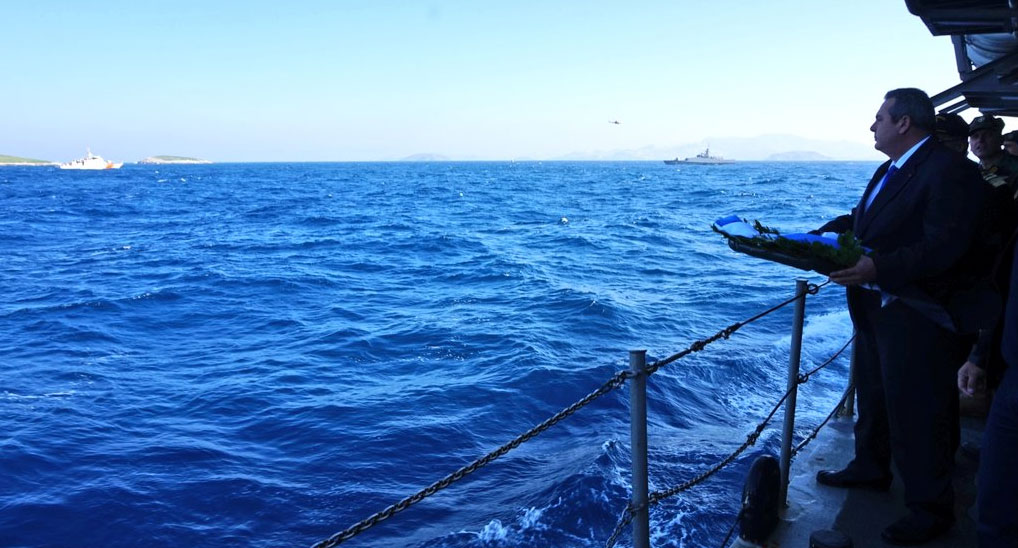 Ο Υπουργός Εθνικής Άμυνας Πάνος Καμμένος, ο Αρχηγός ΓΕΝ Αντιναύαρχος Νικόλαος Τσούνης ΠΝ, ο Κυβερνήτης και το πλήρωμα της Κ/Φ «ΝΙΚΗΦΟΡΟΣ» πραγματοποίησαν ρίψη στεφάνου στο θαλάσσιο χώρο των Ιμίων, στον τόπο θυσίας των τριών ηρώων Ελλήνων Αξιωματικών του Πολεμικού Ναυτικού Παναγιώτη Βλαχάκου, Χριστόδουλου Καραθανάση, Έκτορα Γιαλοψού.