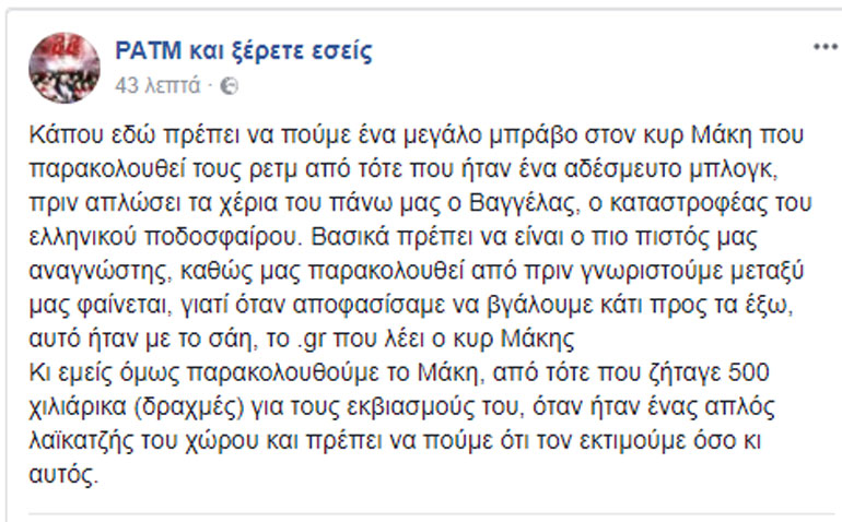 ΤΡΙΤΗ ΑΝΑΡΤΗΣΗ : Κάπου εδώ πρέπει να πούμε ένα μεγάλο μπράβο στον κυρ Μάκη που παρακολουθεί τους ρετμ από τότε που ήταν ένα αδέσμευτο μπλογκ, πριν απλώσει τα χέρια του πάνω μας ο Βαγγέλας, ο καταστροφέας του ελληνικού ποδοσφαίρου. Βασικά πρέπει να είναι ο πιο πιστός μας αναγνώστης, καθώς μας παρακολουθεί από πριν γνωριστούμε μεταξύ μας φαίνεται, γιατί όταν αποφασίσαμε να βγάλουμε κάτι προς τα έξω, αυτό ήταν με το σάη, το .gr που λέει ο κυρ Μάκης