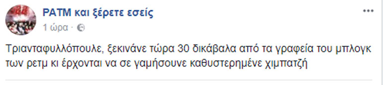 ΔΕΥΤΕΡΗ ΑΝΑΡΤΗΣΗ: Τριανταφυλλόπουλε, ξεκινάνε τώρα 30 δικάβαλα από τα γραφεία του μπλογκ των ρετμ κι έρχονται να σε γαμήσουνε καθυστερημένε χιμπατζή