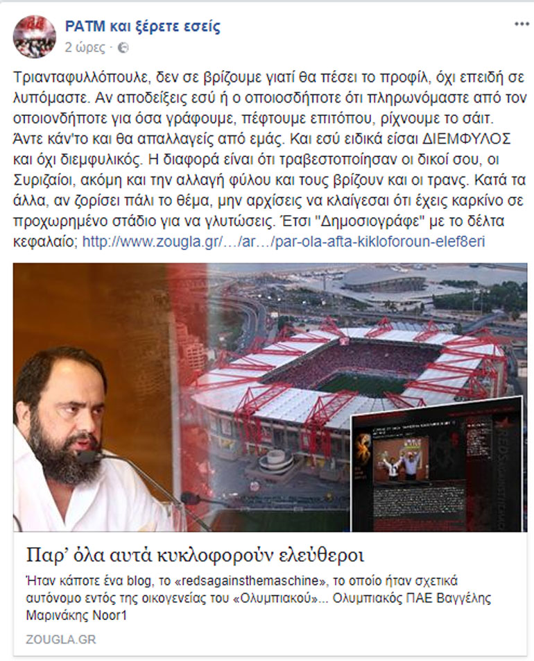 Δεν πρόλαβε να αναρτηθεί το πρωτοσέλιδο του Zougla.gr με τον πρωτοφανή εκβιασμό- απειλή προς την κυβέρνηση εκ μέρους οργανωμένων οπαδών του ιδιωτικού στρατού του Βαγγέλη Μαρινάκη και οι «συντάκτες» του site «redsagainsthemachine» έσπευσαν να ξεκαθαρίσουν τις προθέσεις τους. Αυτά μία ημέρα μετά την άθλια επίθεση κουκουλοφόρων στα γραφεία της εφημερίδας «Έθνος» επί της Συγγρού.