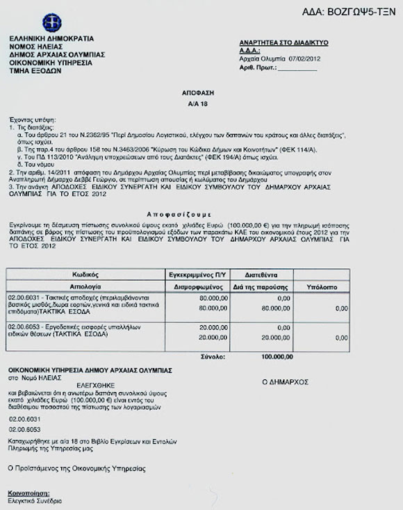 Έντονες επικρίσεις δέχεται ο δήμαρχος Αρχαίας Ολυμπίας, Ε. Κοτζιάς, ο οποίος σύμφωνα με έγγραφο που δημοσιεύτηκε στη ΔΙΑΥΓΕΙΑ προσέλαβε προσωπικό σύμβουλο έναντι 100.000 ευρώ!