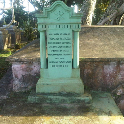 «Here lyeth ye body of Ferdinando Paleologus Descended from ye imperial lyne Of ye last Christian Emperors of Greece Churchwarden of this Parish 1655-1656, Vestryman, Twentye years Died Oct. 3 1678».