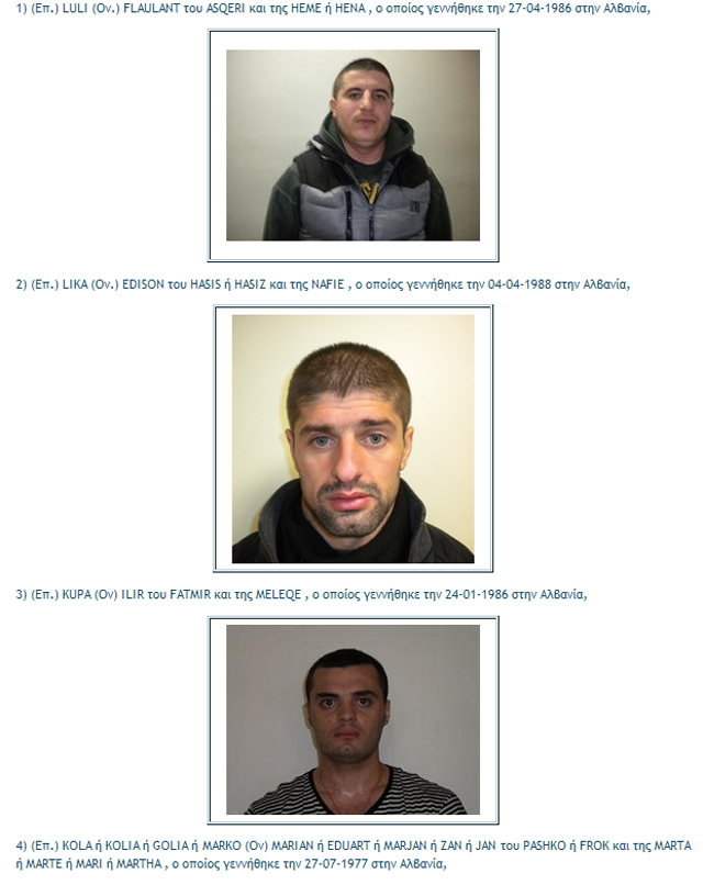 Επίσης, δίνονται στη δημοσιότητα, ύστερα από σχετική διάταξη της Εισαγγελίας Πρωτοδικών Τρικάλων, τα στοιχεία ταυτότητας και οι φωτογραφίες των οχτώ (8) υπόλοιπων δραπετών που διαφεύγουν τη σύλληψη.