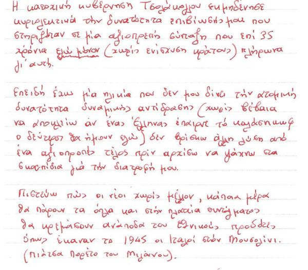«Η κατοχική κυβέρνηση Τσολάκογλου εκμηδένισε κυριολεκτικά τη δυνατότητα επιβίωσής μου που στηριζόταν σε μια αξιοπρεπή σύνταξη που επί 35 χρόνια εγώ μόνον (χωρίς ενίσχυση κράτους) πλήρωνα γι’ αυτήν. Επειδή έχω μια ηλικία που δεν μου δίνει την ατομική δυνατότητα δυναμικής αντίδρασης (χωρίς βέβαια να αποκλείω αν ένας Έλληνας έπαιρνε το καλάσνικοφ ο δεύτερος θα ήμουν εγώ) δεν βρίσκω άλλη λύση από ένα αξιοπρεπές τέλος πριν αρχίσω να ψάχνω τα σκουπίδια για την διατροφή μου. Πιστεύω πως οι νέοι χωρίς μέλλον, κάποια μέρα θα πάρουν τα όπλα και στην πλατεία Συντάγματος θα κρεμάσουν ανάποδα τους εθνικούς προδότες, όπως έκαναν το 1945 οι Ιταλοί στον Μουσολίνι (Πιάτσα Λορέτο του Μιλάνου)» αναφέρει στο σημείωμά του ο αυτόχειρας συνταξιούχος φαρμακοποιός Δ.Χ., 77 ετών.