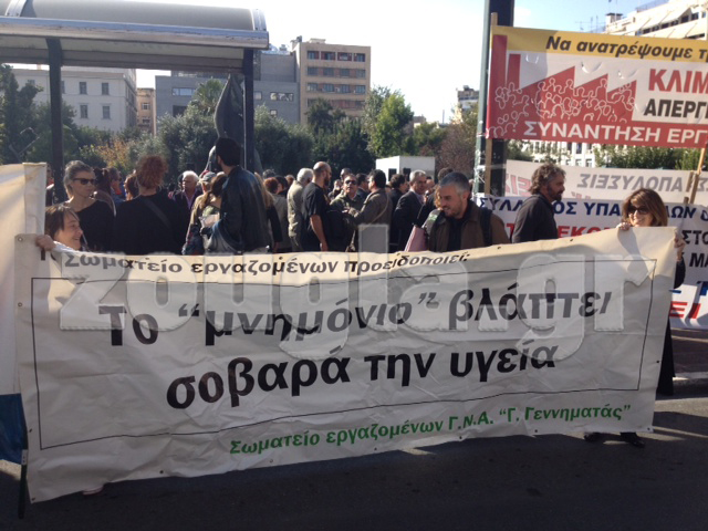 («To Μνημόνιο βλάπτει σοβαρά την υγεία» είναι το σύνθημα των διαδηλωτών)