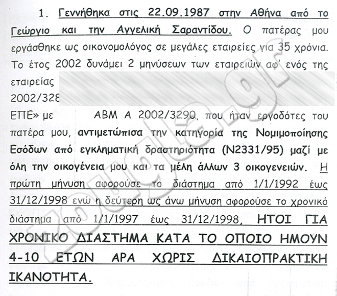 βάρος της Χριστίνας Σαραντίδου, όταν αυτή ήταν ανήλικη. Επίσης προσκομίστηκε πρόχειρο σχέδιο δικαστικής απόφασης που φέρει την υπογραφή του τότε προέδρου Πρωτοδικών Αθηνών και νυν εφέτου, ο οποίος σε απόφαση που φέρεται να του… δόθηκε γραμμένη σε υπολογιστή προβαίνει σε χειρόγραφες διορθώσεις του κειμένου, καθώς οι εντολείς του είχαν λησμονήσει να απαλείψουν εκφράσεις σε πρώτο πληθυντικό πρόσωπο, όπως «ημών», «μας», «η εταιρεία μας», «ο δικηγόρος μας». Ο εν λόγω δικαστής αφού έσβηνε τις… προαναφερόμενες λέξεις, χειρόγραφα ανέγραφε «της αιτούσης», «της εταιρείας» κτλ.