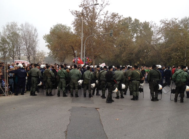 Διαμαρτυρία πραγματοποίησαν κατά τη διάρκεια της παρέλασης, στην παραλιακή λεωφόρο της Θεσσαλονίκης, μέλη των ΣΥΡΙΖΑ και της ΑΝΤΑΡΣΥΑ καθώς και εκπαιδευτικοί που υπερασπίζονται το δημόσιο σχολείο. Οι διαδηλωτές κρατούσαν πανό, ωστόσο, οι ισχυρές αστυνομικές δυνάμεις τους περιόρισαν στο ύψος της Γ’ Σεπτεμβρίου.