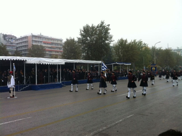 Κάτω από δρακόντεια μέτρα ασφαλείας και ένα πυκνό πέπλο ομίχλης, πραγματοποιήθηκε η στρατιωτική παρέλαση στην παραλιακή λεωφόρο Μεγάλου Αλεξάνδρου στη Θεσσαλονίκη, ενώπιον του Προέδρου της Δημοκρατίας, Κάρολου Παπούλια.