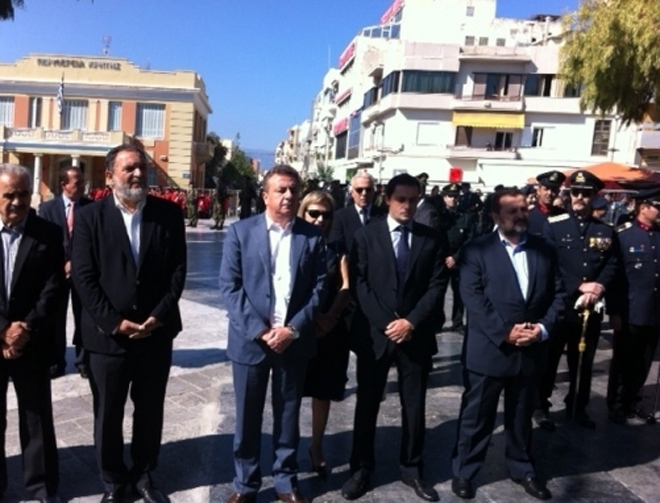 Με γιουχαΐσματα αλλά και χτυπώντας τα κάγκελα που είχαν τοποθετηθεί περιμετρικά του Μνημείου του Άγνωστου Στρατιώτη, υποδέχτηκαν ομάδες πολιτών στο Ηράκλειο, τον Υφυπουργό Εργασίας, Βασίλη Κεγκέρογλου, τον βουλευτή της ΝΔ Μάξιμο Σενετάκη και εκπροσώπους των τοπικών φορέων, που βρέθηκαν εκεί για την τελετή της κατάθεσης στεφάνων.