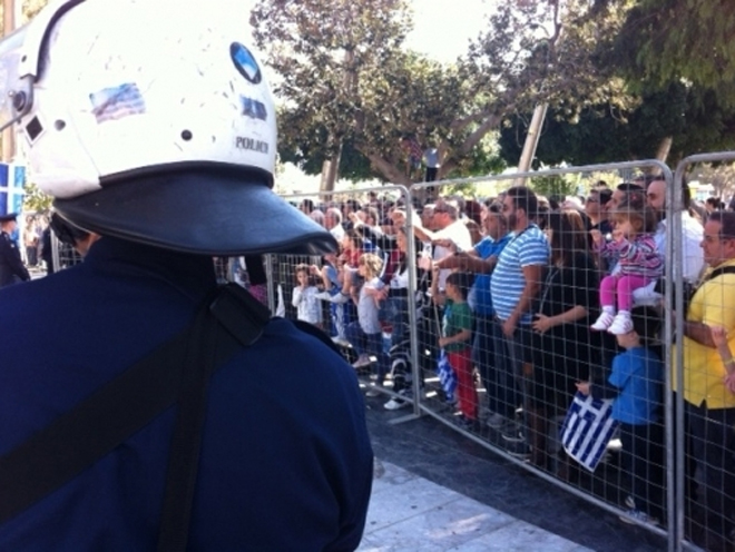 Ο χώρος γύρω από το Μνημείο είχε αποκλειστεί από νωρίς ενώ εκεί βρέθηκαν και δεκάδες αστυνομικοί, στο πλαίσιο των ισχυρών μέτρων ασφαλείας που ελήφθησαν τόσο στο Ηράκλειο όσο και στις άλλες μεγάλες πόλεις της χώρας, για να αποτραπούν «παρατράγουδα» στην διάρκεια των εκδηλώσεων εορτασμού της Εθνικής επετείου.
