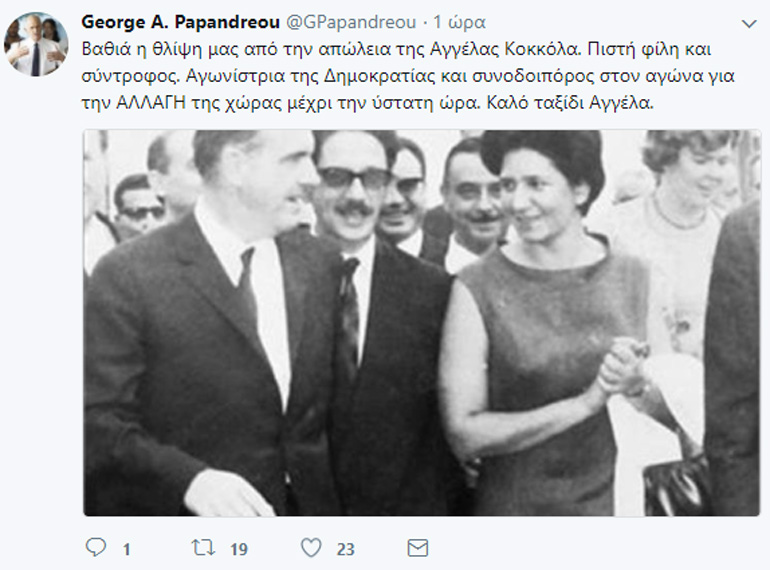 «Βαθιά η θλίψη μας από την απώλεια της Αγγέλας Κοκκόλα. Πιστή φίλη και σύντροφος. Αγωνίστρια της Δημοκρατίας και συνοδοιπόρος στον αγώνα για την ΑΛΛΑΓΗ της χώρας μέχρι την ύστατη ώρα. Καλό ταξίδι Αγγέλα», έγραψε στο Twitter ο πρώην πρωθυπουργός Γιώργος Παπανδρέου.