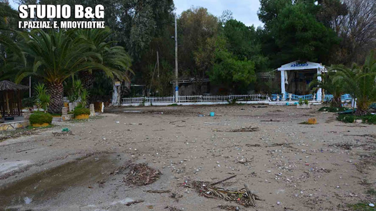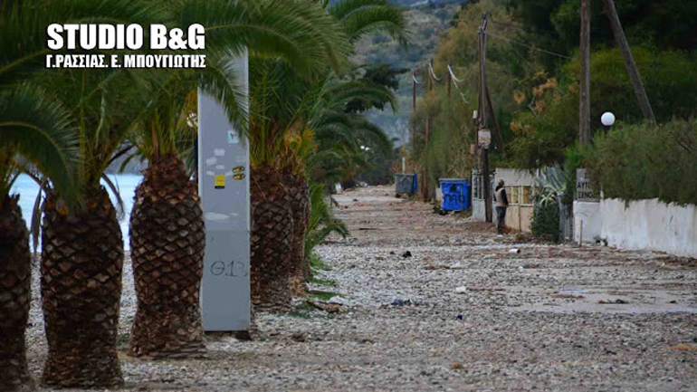 Από τις 23.00 το βράδυ του Σαββάτου έως σήμερα τα ξημερώματα η έντονη βροχόπτωση και οι θυελλώδεις νοτιάδες, σε συνδυασμό με τη σφοδρή θαλασσοταραχή, προκάλεσαν μεγάλες καταστροφές στο παραλιακό μέτωπο των τουριστικών χωριών του Ναυπλίου, αφού η θάλασσα βγήκε έξω και μπήκε μέσα σε υπόγεια και ισόγεια σπιτιών και καταστημάτων, κάνοντας μεγάλες ζημιές, ενώ μαζί της έφερε πολλά φερτά υλικά, κυρίως βότσαλα.