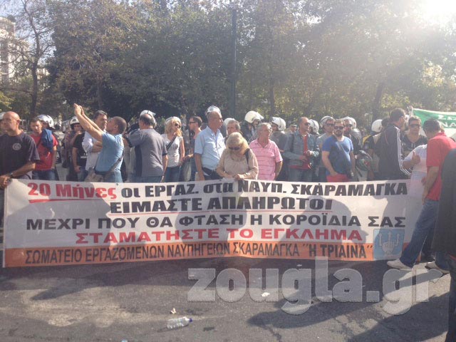 Συγκέντρωση διαμαρτυρίας πραγματοποίησαν το πρωί έξω από το Υπουργείο Ανάπτυξης εργαζόμενοι των ναυπηγείων Σκαραμαγκά.